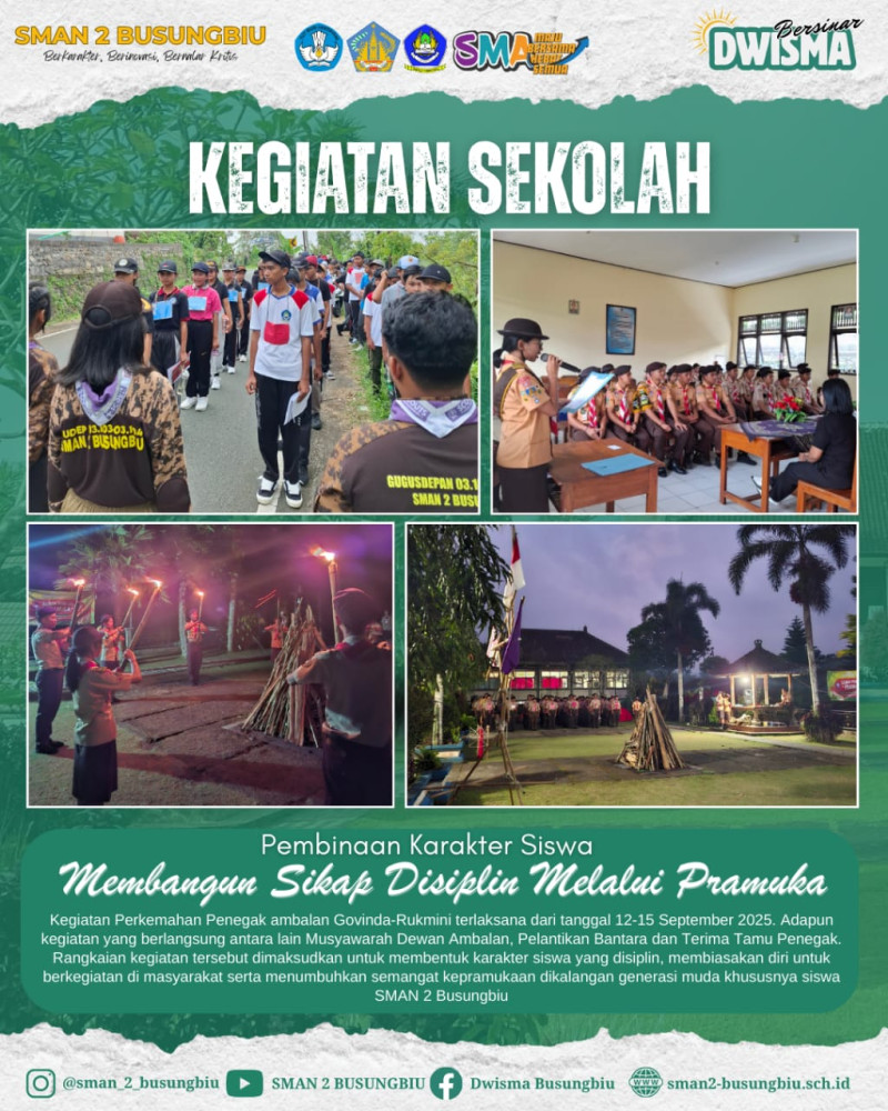 SMA Negeri 2 Busungbiu kembali menyelenggarakan kegiatan Kemah Penegak Ambalan Govinda Rukmini yang berlangsung pada 12–15 September 2025. Kegiatan rutin tahunan ini menjadi salah satu program unggulan ekstrakurikuler Pramuka sebagai wadah pembentukan karakter generasi muda.