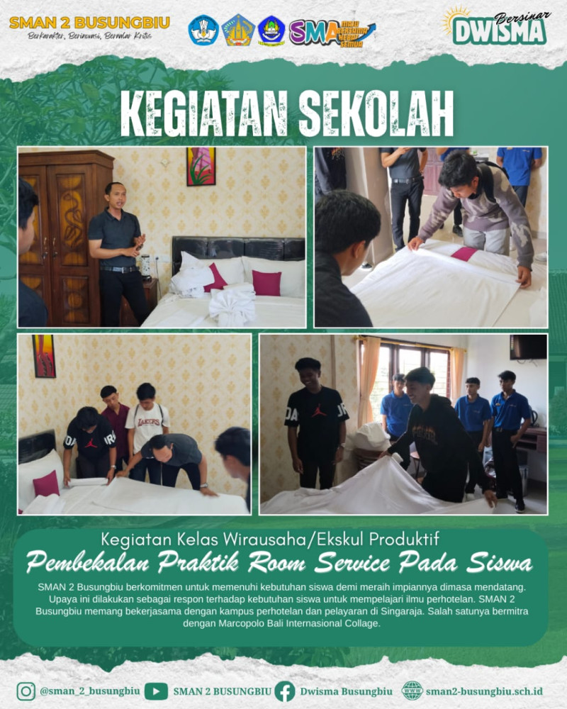 Sebagai bentuk komitmen dalam memfasilitasi minat dan bakat siswa di bidang pariwisata, SMAN 2 Busungbiu resmi membuka Ekstrakurikuler Perhotelan. Program ini dihadirkan untuk menjawab kebutuhan siswa yang ingin mengenal lebih dekat dunia perhotelan sekaligus mempersiapkan diri menghadapi peluang di industri pariwisata.