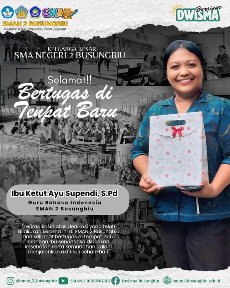 Hari ini bukanlah tentang perpisahan, melainkan tentang melanjutkan perjalanan baru. Keluarga besar SMAN 2 Busungbiu dengan penuh rasa hormat melepas tugas salah satu pendidik terbaiknya, Ibu Ketut Ayu Supendi, S.Pd, yang akan melanjutkan pengabdian di tempat tugas yang baru.