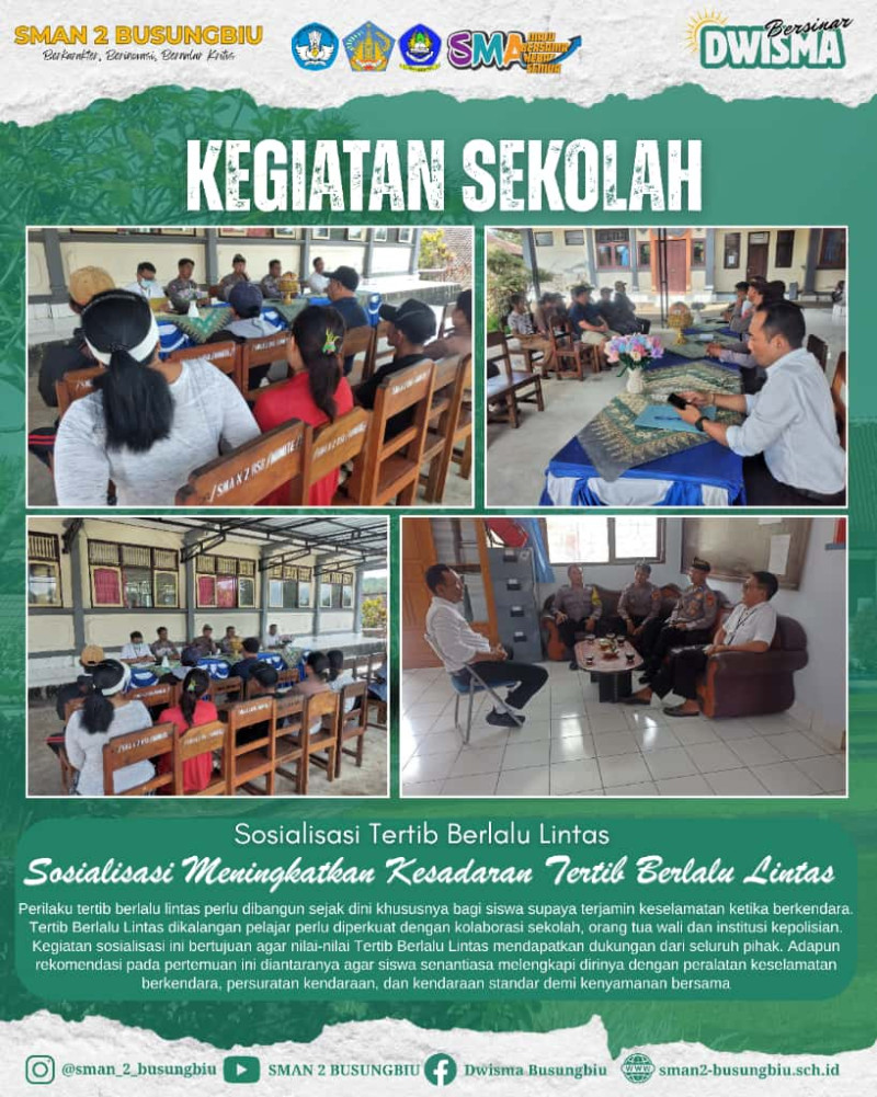 SMAN 2 Busungbiu kembali menunjukkan komitmennya dalam membangun karakter disiplin dan budaya tertib berlalu lintas di kalangan peserta didik. Hari ini, sekolah menerima kunjungan dari Polsek Busungbiu bersama perwakilan wali murid dalam kegiatan sosialisasi keselamatan berkendara. Kegiatan ini menjadi wujud kolaborasi antara pihak sekolah, kepolisian, dan masyarakat untuk menciptakan lingkungan belajar yang aman dan disiplin, terutama dalam hal berlalu lintas. Sosialisasi disampaikan langsung oleh Kanit Lalu Lintas dan Bina Masyarakat (Binmas) Polsek Busungbiu, yang memberikan edukasi mengenai tata cara berkendara yang aman dan sesuai peraturan.