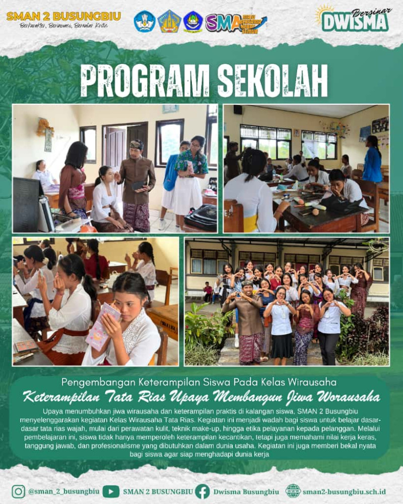 Kegiatan ini merupakan bagian dari visi SMAN 2 Busungbiu dalam mencetak generasi muda yang kreatif, mandiri, dan berkarakter. Selain tata rias, program Kelas Wirausaha juga mencakup bidang-bidang menarik lainnya seperti Perhotelan, Bahasa Jepang, dan Barber. Semua bidang tersebut dirancang untuk memberi pengalaman belajar yang aplikatif dan relevan dengan kebutuhan dunia industri maupun dunia usaha.