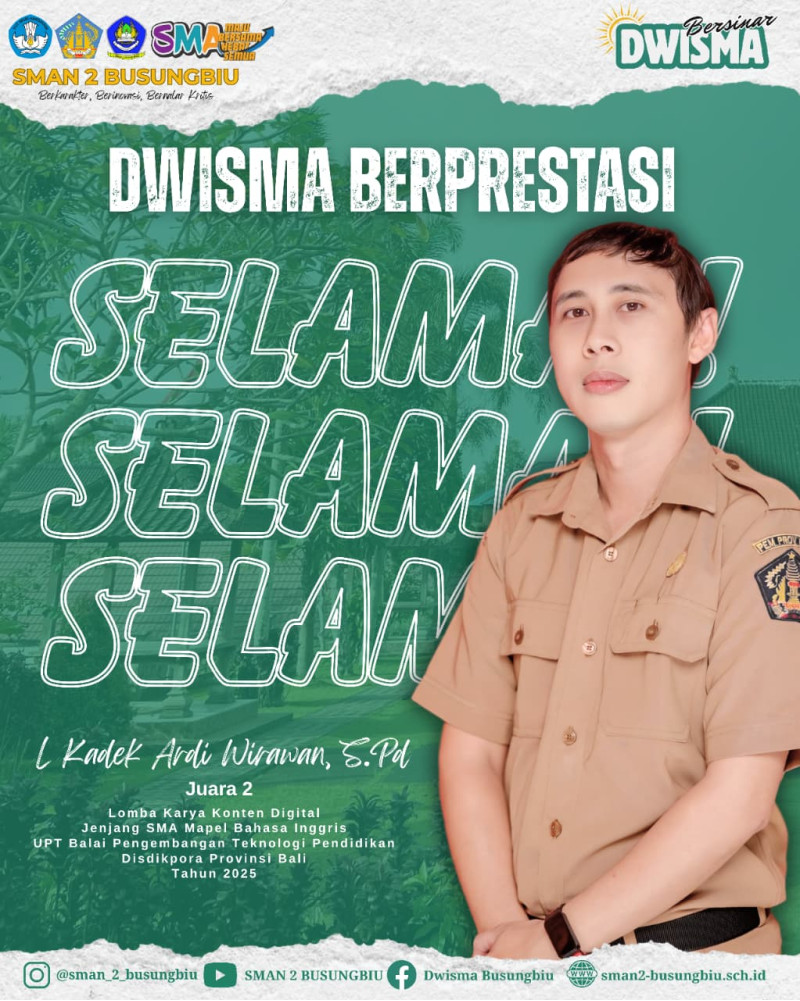 Setelah sebelumnya siswa-siswi SMAN 2 Busungbiu menorehkan berbagai prestasi membanggakan, kali ini prestasi gemilang datang dari salah satu pendidik terbaik sekolah. Keluarga Besar SMAN 2 Busungbiu dengan penuh rasa bangga mengucapkan selamat dan sukses kepada Bapak I Kadek Ardi Wirawan, S.Pd. atas keberhasilannya meraih prestasi dalam Lomba Karya Konten Digital Tingkat Provinsi. π€©π€©β€οΈβπ₯β€οΈβπ₯