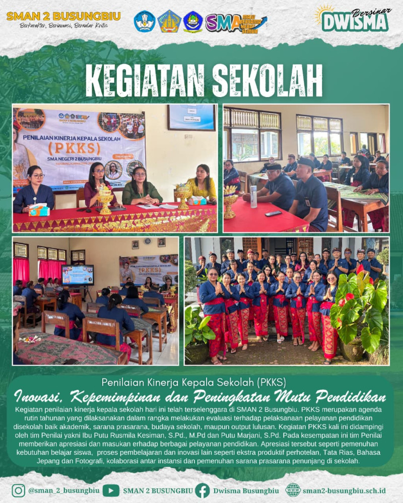 PKKS ini menilai berbagai aspek strategis, meliputi kepemimpinan, manajemen sekolah, inovasi pembelajaran, serta hubungan dan peran sekolah dengan masyarakat. Penilaian tersebut berfokus pada kinerja Kepala SMAN 2 Busungbiu, Ibu Luh Eka Yanthi, S.Pd., M.Pd., yang telah menjalankan tugas dan tanggung jawabnya dalam memajukan sekolah serta membangun budaya sekolah yang positif, inklusif, dan berorientasi pada kebutuhan peserta didik.
