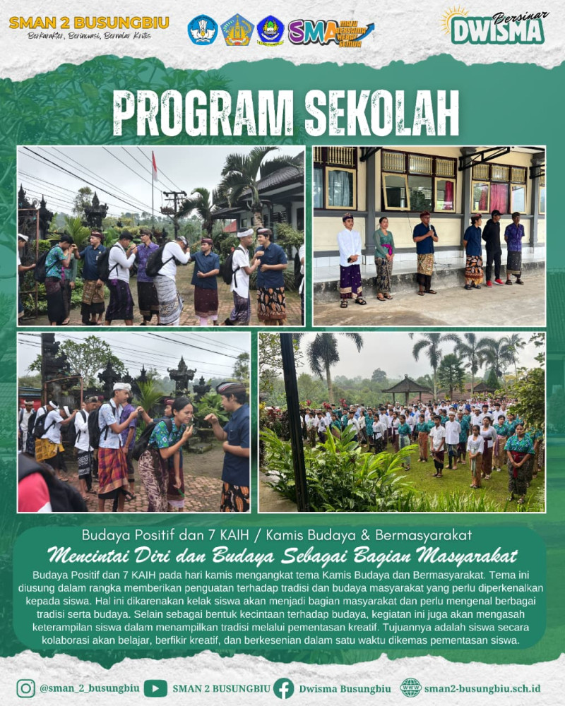 Kamis Budaya dan Bermasyarakat dilaksanakan setiap hari Kamis sebagai bagian dari implementasi Program Budaya Positif dan 7 KAIH. Program ini diharapkan mampu membentuk generasi muda yang tidak hanya cerdas secara akademik, tetapi juga memiliki jati diri, berkarakter luhur, serta mampu hidup bermasyarakat dengan menjunjung tinggi nilai-nilai budaya.