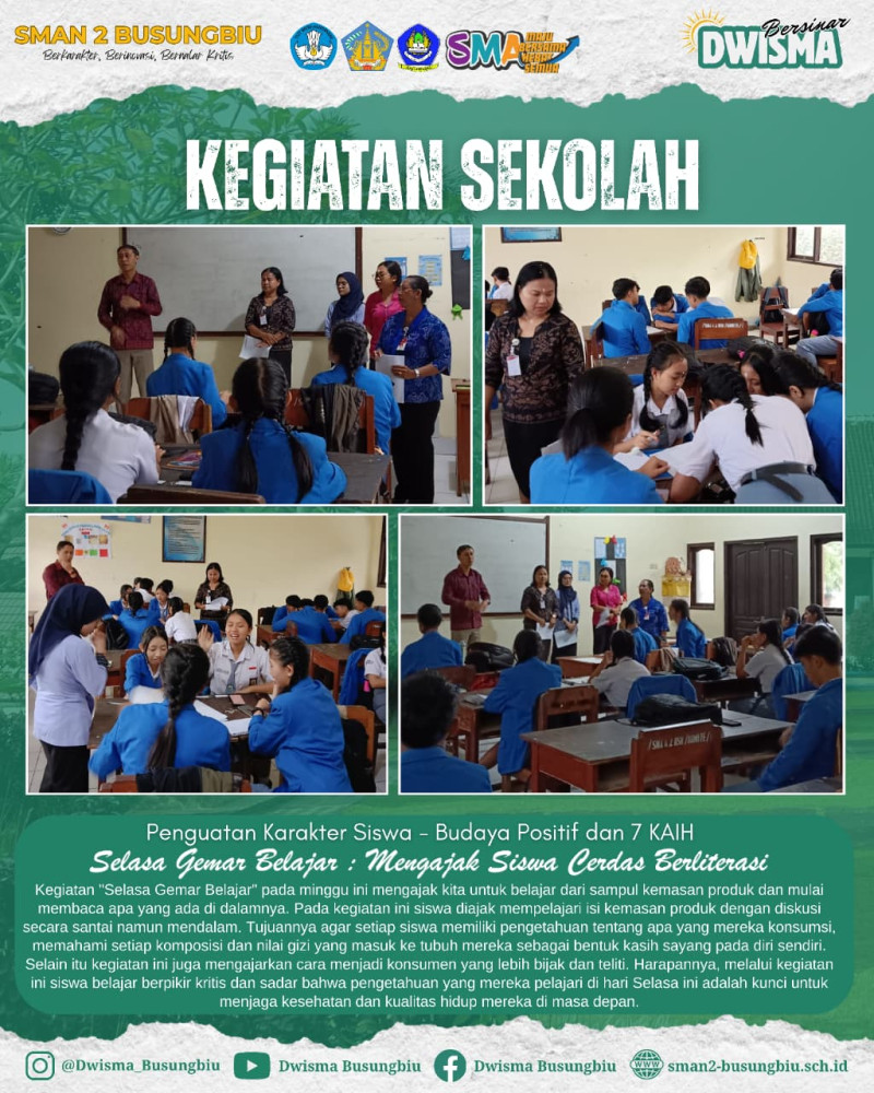Busungbiu, Selasa — Suasana pembelajaran di SMAN 2 Busungbiu terasa berbeda dan lebih dekat dengan kehidupan sehari-hari dalam kegiatan Selasa Gemar Belajar Literasi Numerasi. Melalui kegiatan ini, siswa diajak untuk memahami bahwa literasi dan numerasi bukan sekadar membaca teks, angka, atau komposisi, tetapi juga tentang membangun kesadaran, kepedulian, dan kebijaksanaan dalam mengambil keputusan.