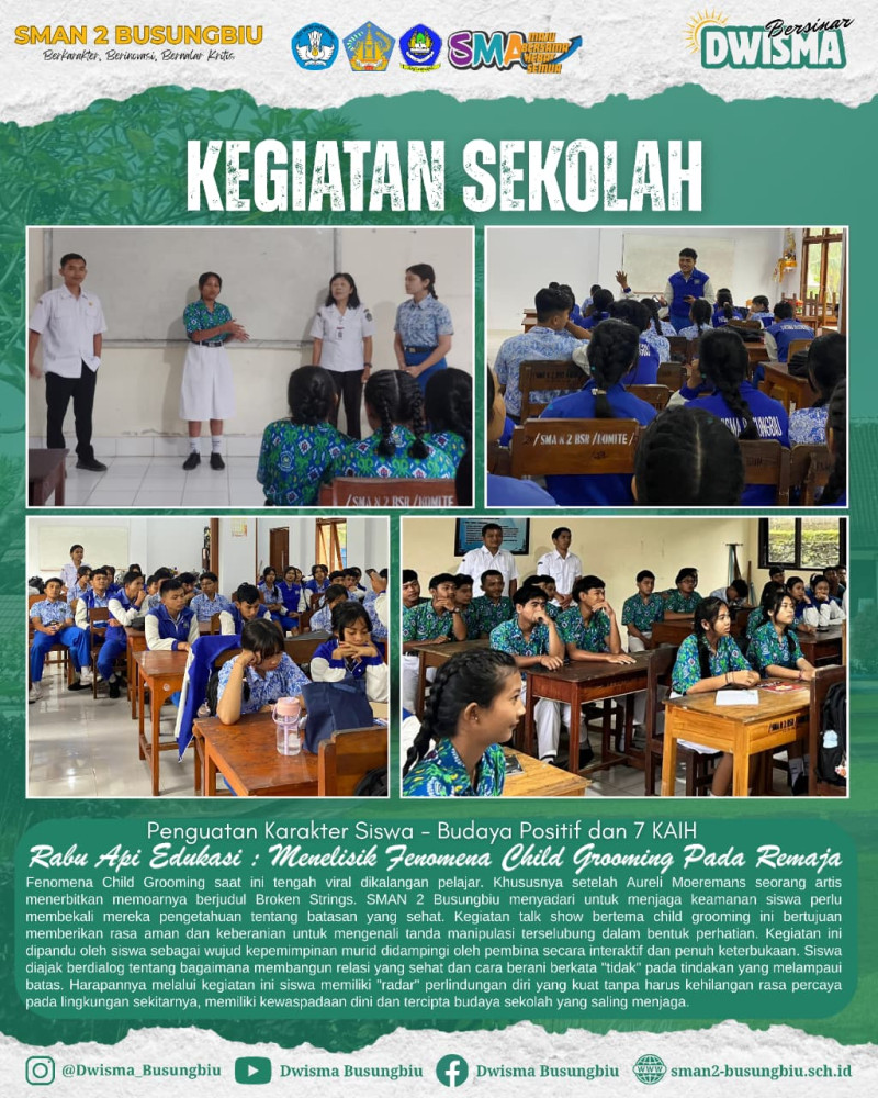 Busungbiu, Rabu — SMAN 2 Busungbiu kembali menyelenggarakan kegiatan Rabu Api Edukasi (Anti Perundungan, Inspirasi, dan Edukasi) sebagai bagian dari komitmen sekolah dalam menciptakan lingkungan belajar yang aman, peduli, dan berkarakter. Kali ini, kegiatan dikemas dalam bentuk talk show edukatif tentang pencegahan Child Grooming, sebuah isu penting yang semakin relevan dengan kehidupan remaja saat ini.
